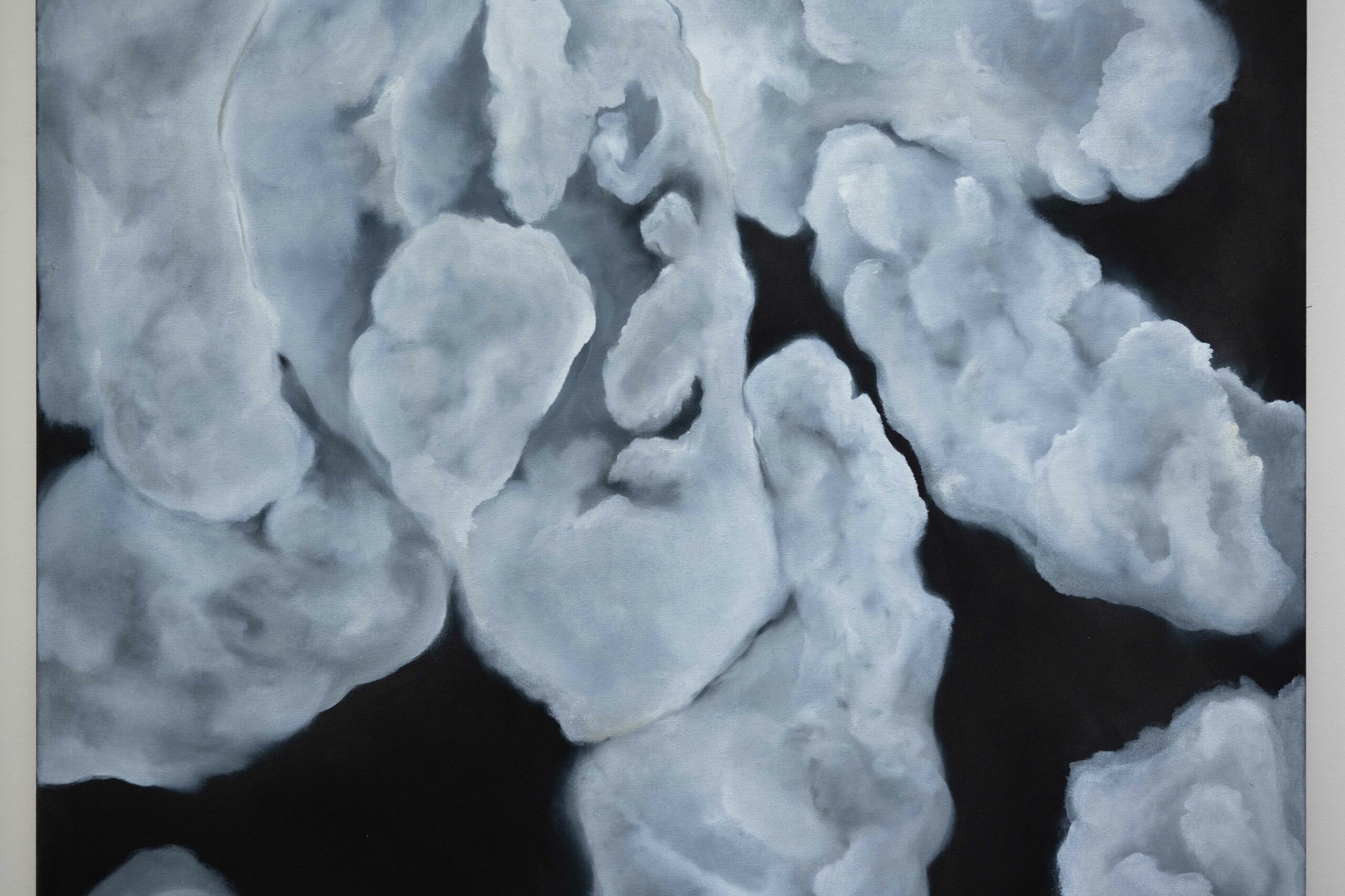 “Temple of Men” is a multi-part work consisting of drawings, paintings, and videos. Here, I present a small segment of my engagement with masculinity as both an idea and a symptom. While planning the exhibition, I repeatedly thought of the interior of a church — perhaps also of the interior of a man, whose petrifications become visible in the cloud formations.